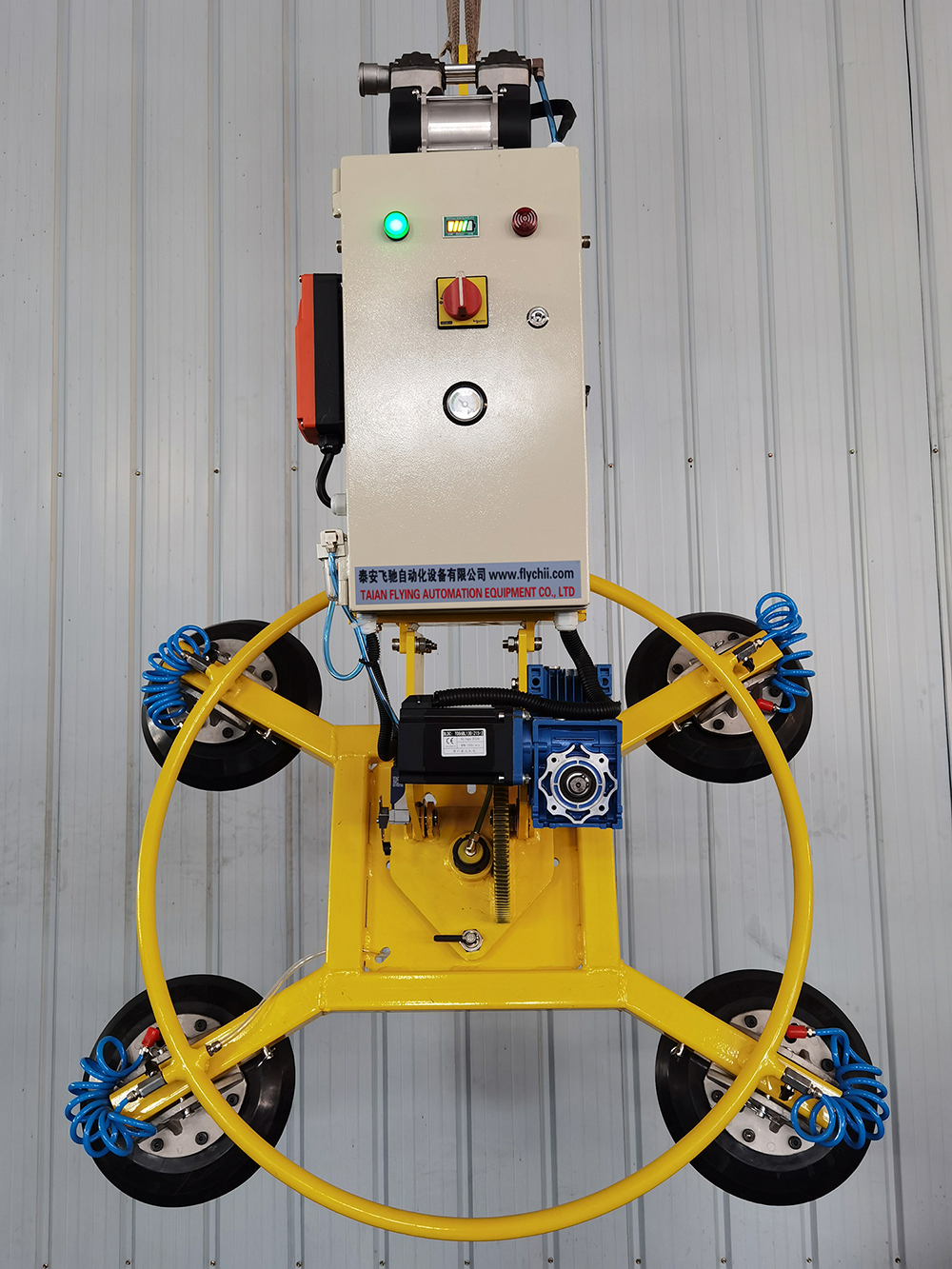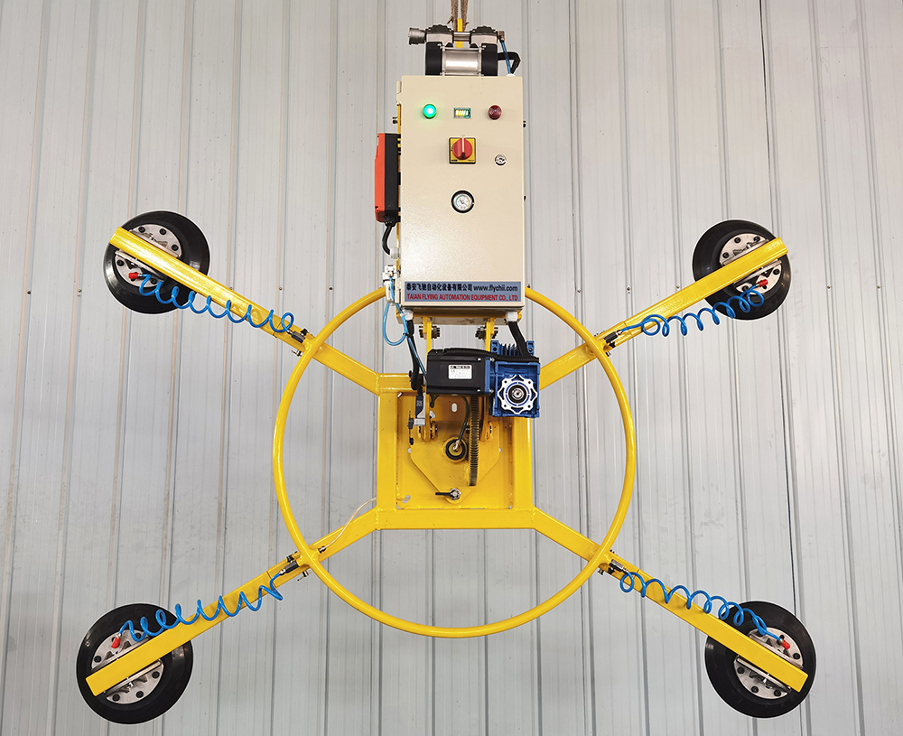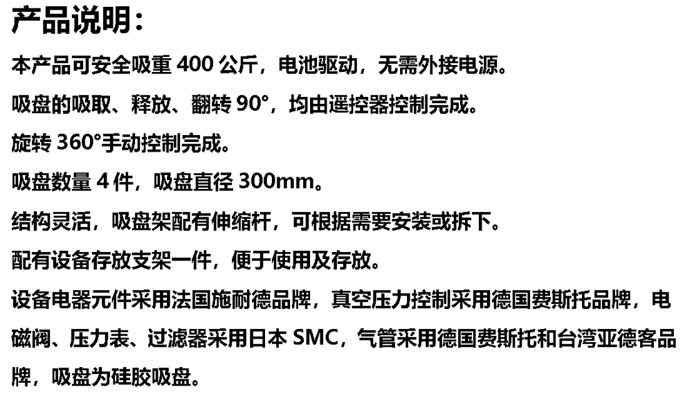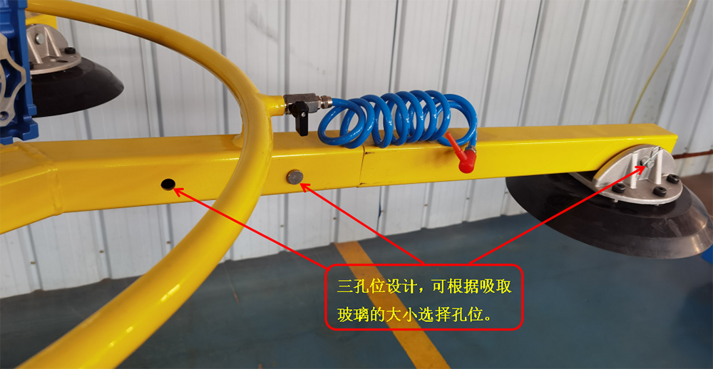 该设备可根据需要多种方式组装,变换吸盘位置实现吸取不同形状及尺寸的玻璃,使用时无需外接电源,安全可靠。